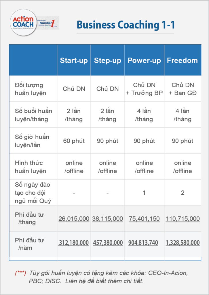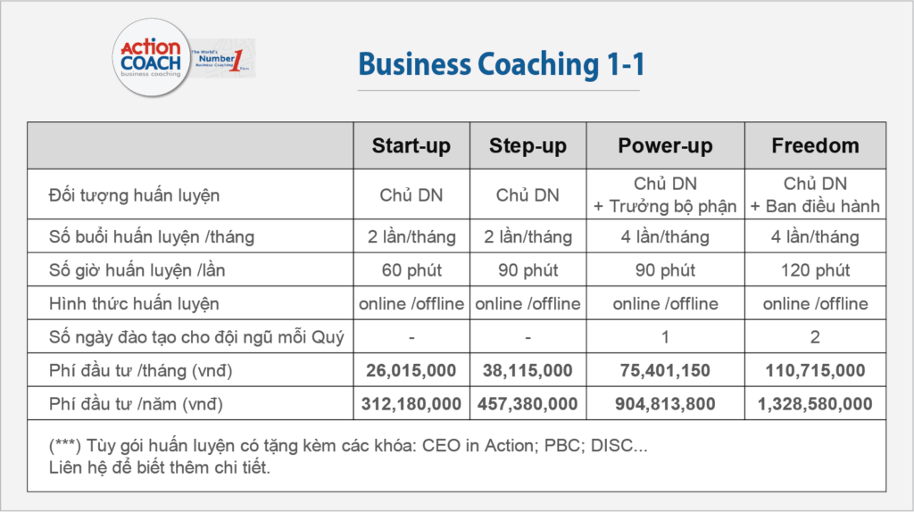 > Huấn luyện Business coaching 1-1 cần thời gian để Chủ doanh nghiệp thực thi, đo lường và tối ưu. Do đó, thời hạn huấn luyện phải đủ dài hạn từ 1-3 năm; tối thiểu là 1 năm. Có cam kết kết quả huấn luyện.